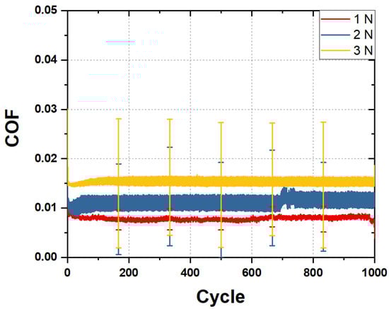 COF of 20% 12H specimen performed at 1–3 N and 1000 cycles under water lubrication.