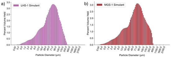 The second regolith is Mars Global Simulant (MGS-1). This simulant is more mixed, with a mineral composition of anorthosite (27.1 wt%), glass-rich basalt (22.9 wt%), pyroxene (20.3 wt%), and olivine (13.7 wt%) [22]. The particle size (diameter) is shown as a function of the percent volume held in Figure 1b).