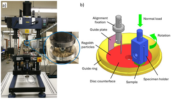 (a) Test setup and (b) model of pin-on-disc assembly with the installed regolith guide plates and ring.