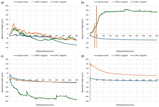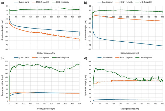 The initial height increase at the start of the tests was the highest (~10–180 µm) in the case of the LHS-1 regolith, suggesting that the specimen was running on a layer of particles. The quartz sand had a reduced effect on the initial run setting. Not only the particle size and angularity are responsible for this, but also the packing density of the external regolith. In the case of the steel counterface tests, a clear decreasing trend could be established for the seal specimen height with increasing sliding distance.
