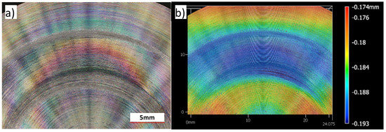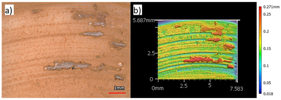(a) Optical image and (b) 3D topography of the partially removed surface layer of a pure PTFE packing sample tested on 34CrNiMo6 steel with quartz sand.