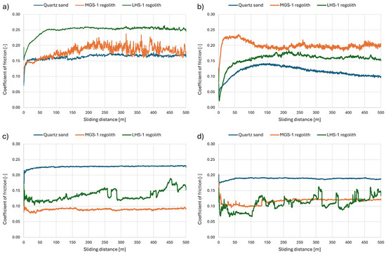 Figure 8 shows the influence of external abrasive particles on the coefficient of friction of the lip seal specimen. The friction curves showcase the main friction components: adhesion and surface deformation, which are influenced by the embedding and erratic movement of regolith particles. These effects vary according to the properties of the contacting surfaces and the tribological system. This complex third-body phenomenon has been extensively described in the literature [37]. In the initial stages of the sliding in all test systems, during the running-in, the regolith particles enter the contact zone with varying dynamics. Subsequently, a macro-trend emerges, representing the dynamic equilibrium of friction. This equilibrium is characterized by localized transient behaviors influenced by the specific attributes of the tribological system. On steel surfaces, quartz sand resulted in a relatively uniform third-body mechanism. The distinct compositions and adhesion characteristics of LHS-1 and MGS-1 regoliths led to contrasting friction patterns between the natural and composite PTFE lip seal specimens. The lower grain-embedding capability of the harder composite PTFE resulted in more consistent friction with MGS-1 regolith compared to natural PTFE pin. In the case of the PEEK countersurface, the higher adhesion tendency between the polymers prevailed, particularly in the presence of quartz sand, while in the case of LHS-1, the process was characterized by friction instability.