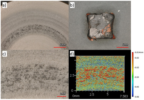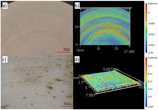 The post-mortem 3D topography analysis revealed a reduction in surface height within the wear track of the counterface disc materials attributed to abrasion caused by the polymer sample with the external particles. An example is shown in Figure 10, where the blue region represents the wear track with reduced surface height.
