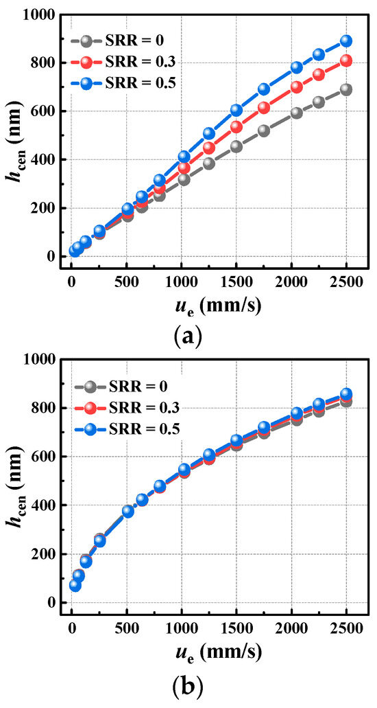 To investigate the influence of oil and body temperatures on EHL films numerically, Figure 6 illustrates the variations in central film thickness with entrainment speed under different SRRs. The temperatures of both the oil and contact bodies are set according to the experimental heating methods employed. To facilitate comparisons between the curves under different conditions, the linear–linear scale is employed instead of the log–log scale. In Figure 6a, where the oil and ball temperatures exceed that of the disc surface, an artificial temperature gradient is induced across the oil film, consequently resulting in a viscosity gradient as well. The term ‘temperature gradient’ is specifically employed in subsequent analysis to differentiate it from the conventional thermal viscosity wedge mechanism that occurs spontaneously due to oil shear, thereby describing the mechanism resulting from temperature differences between the contacting bodies. It should be noted that this situation differs from the thermal viscosity wedge mechanism, wherein the disc surface temperature is higher than that of the ball surface. The external imposed temperature gradient acts as a counteractive mechanism against the thermal effect generated by the film itself, even becoming the dominant factor governing film formation. The higher the SRR, particularly at elevated speeds, the higher the overall film thickness. This is attributed to thick oil being entrained into the contacts by the disc surface due to its lower temperature while thin oil is entrained by the hot ball surface. According to the definition of the SRR, a larger value indicates a faster disc surface speed and greater entrainment of thick oil into the contacts, thus contributing significantly to film formation. Furthermore, the oil temperature in this case is obviously higher than that depicted in Figure 6b, resulting in a much lower inlet viscosity. This unfavorable condition inhibits the establishment of an EHL film, which emphasizes the profound influence of the external temperature gradient on film formation.