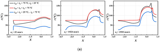 In the above analysis, the nominal inlet ambient viscosity is used to describe its contribution to film formation. In fact, the actual inlet ambient is different from the nominal one due to the heat transfer to the oil. To observe the temperature distributions at the inlet region and in the contacts, Figure 8 illustrates the temperature profiles in the middle layer of the film on the Y = 0 section. Three distinct entrainment speeds are chosen to represent low, moderate, and high velocities. Again, three heating methods and three SRRs are employed. Prior to oil entrainment into the contact region, variations in temperature along the X direction differ depending on the heating method employed. In Figure 8a, a decreasing trend followed by an increasing trend is observed due to higher oil temperatures compared to those of the disc surface. Heat transfer occurs from the oil to the disc body until reaching a final equilibrium state. With increasing speed, there is a shift in position towards the contact region for the location of minimal temperature. The opposite temperature variations observed in Figure 8b can be attributed to the reverse heat transfer occurring from the disc to the oil. In Figure 8c, a constant oil temperature is maintained due to the absence of any heat exchange between the oil and solid surfaces. Since the inlet ambient viscosity determines the film formation and the pressure begins to establish in the inlet convergent gap, the actual oil temperatures are listed in Table 4 to show the influence of heat transfer. It can be seen that in the case of t0 = tb = 75 °C and td = 25 °C, the oil temperature ranges from 55.39 °C to 69.60 °C for all speeds, which is lower than the nominal temperature of 75 °C due to the heat transfer to the disc surface. From Figure 3, it is evident that viscosity decreases within the range of 55.39 °C to 75 °C, with corresponding values ranging from 37.5 mPa·s to 15 mPa·s. When t0 = tb = 25 °C and td = 75 °C, the oil temperature ranges from 33.05 °C to 45.69 °C, with the corresponding viscosity ranging from 125 mPa·s to 75 mPa·s, which is much higher compared to the case of t0 = tb = 75 °C and td = 25 ℃, but a similar film thickness magnitude as the case of t0 = tb = 75 °C and td = 25 °C is maintained. This confirms that the temperature gradient effect plays crucial a role in establishing the film thickness in the case of oil and ball heating. No obvious temperature change is found in the case of entire system heating, where the low ambient viscosity results in a low film thickness.