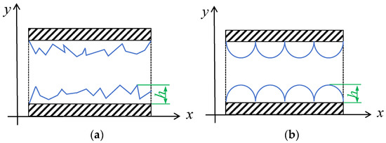Accessing the information, the absolute roughness of the inner surface of the new seamless steel pipeline is approximately between 0.01 and 0.02 mm, where the surface particles, averaging about 20 µm high, are modeled as uniform arc-shaped protrusions (Figure 4). This model enables a more precise evaluation of how the coating fills and covers the pipeline’s roughness, determining the ideal thickness for practical and durable coverage. The findings suggest that the roughness level is critical to determining the necessary coating thickness, which must be ample to envelop the pipeline’s uneven texture, ensuring the coating’s performance and longevity. The roughness of the coated pipeline changes. With coating thicknesses of 10 µm and 20 µm, the roughness decreases. However, at a coating thickness of 30 µm, the coating covers the surface roughness, resulting in a smooth pipeline.