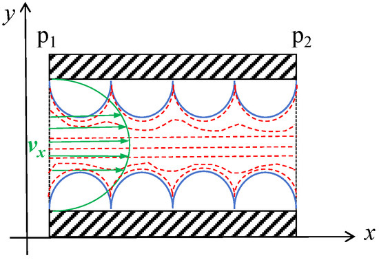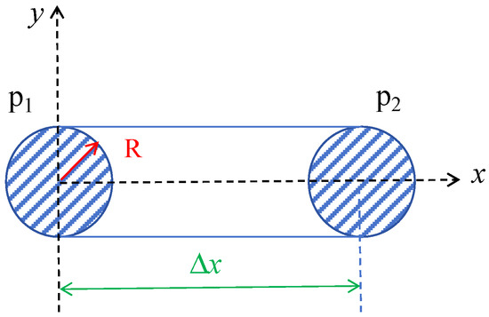 Figure 6 illustrates a fluid section of length Δx inside a pipeline with radius R, where the flow is steady and laminar. The inlet pressure is p1, and the friction coefficient between the pipeline and the pipeline wall is μ. The pressure gradient is consistent along the flow’s direction, leading to an outlet pressure represented by Equation (10). This gives rise to a pressure difference across the pipeline length, as shown in Equation (11). The shear force F at the wall arises due to the friction between the fluid and the pipeline, which is Equation (12).