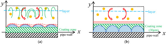 In Figure 8, the distance Sx from the bottom to the top of any surface irregularities diminishes, resulting in a reduced pressure difference (p1 > p2 > p3) along the flow direction. With a thicker coating, the flow’s velocity gradient next to these protrusions decreases in the x direction, while momentum exchange continues in the y direction. These two effects lead to a drop in shear stress and flow resistance over the protrusions. The optimal drag reduction is observed with a 20 µm coating, where the pipeline surface becomes smoother, reducing turbulence. At 30 µm, despite a further smoothed surface, the velocity vy effectively reaches 0, causing momentum exchange to diminish and rely solely on molecular motion, which decreases the drag reduction effect. Nonetheless, this effect remains superior to that observed with thinner coatings of 10 µm and uncoated pipelines.