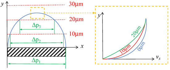 Given the laminar flow without velocity changes, the net force equals 0, simplifying Equations (13) and (14). The velocity of the oil near any surface irregularities is divided into components along the flow vx and perpendicular to vy (Figure 6). The more significant the velocity gradient in the x direction of flow (dvx0/dt > dvx10/dt > dvx20/dt) corresponds to a higher friction coefficient, a thinner boundary layer, and more significant shear stress between adjacent flow layers. An increase in vy, the velocity component perpendicular to the flow, enhances momentum exchange between layers, equalizing the velocities and reducing shear stress.
