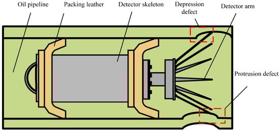 Using pipelines for oil transport has stability, economy, and efficiency far beyond sea, road, and rail transport [1,2,3,4,5,6]. Oil transport pipelines have rapidly gained popularity and formed a worldwide oil transport network [7]. With the increase in the service life of oil pipelines, the aging of pipeline infrastructure is obvious, including corrosion, creep, deformation, and cracking [8,9,10,11]. Oil pipelines are often buried underground or placed in locations that are difficult for maintenance personnel to reach, such as the seabed. Oil leaks are usually not detected in time, and large quantities of leaking oil can cause damage to the natural environment and huge economic losses to transport companies [12,13,14]. In order to avoid the occurrence of oil pipeline leakage accidents, it is necessary to check the internal condition of the pipeline regularly. If large deformations, broken welds, cracks, corrosion, and other defects are found inside the pipeline, they need to be repaired or replaced. Caliper pig is a very effective inspection tool for detecting the geometric information inside the pipe, measured by direct contact between the inspection arm and the inner wall of the pipe [15,16].