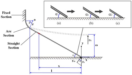 Wear model of the detection arm. (a) Model when the detection arm is not worn; (b) model when the detection arm is worn, and the contact point becomes a contact surface; (c) model with continuous wear of the detector arm, where the wear thickness is equal to the thickness of the detector arm.