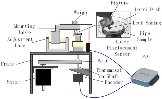 The inspection arm wear test system consists of three parts: the rack system, the power system, and the test system, as shown in Figure 3. The frame system comprises a frame, an adjustment base, and a mounting table. The transmission system consists of a motor, belt, transmission shaft, and base. The test system consists of a leaf spring fixture, petri dish, leaf spring sample, pipe sample, weights, laser displacement sensor, rotary encoder, and DAQ data acquisition card.
