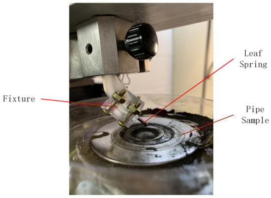 In the first step, the weight was set to 10 N so that the motor drove the pipe specimen to move at a speed of 1 r/s, and the radius of rotation was 0.015 m, i.e., the leaf spring specimen was running at a speed of 0.0942 m/s. The pipe specimen was run continuously for 50 h, i.e., the total mileage of the run was 16,956 m. The motor was stopped at this time, and the leaf spring abrasion amount was calculated.