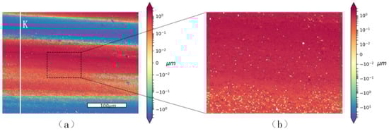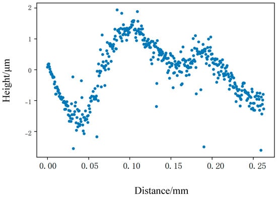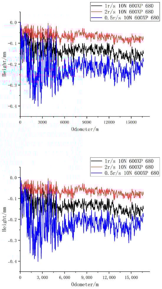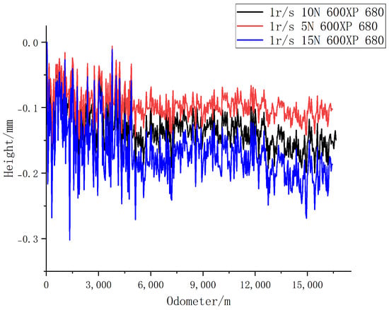 For 600XP-680 lubricant under a 5 N load, after running at a speed of 1 r/s for 50 h, the laser ranging sensor acquisition signal is processed to obtain Figure 34a; 600XP-680 lubricant under a 15 N load, after running at a speed of 1 r/s for 50 h, the laser ranging sensor acquisition signal is processed to obtain Figure 34b.