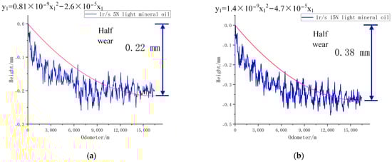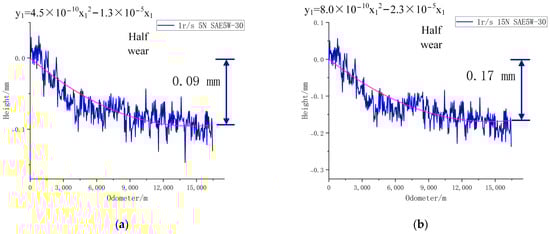 Wear curves of leaf spring for loads of 5 N and 15 N. (a) Wear curve of leaf spring under a load of 5 N using SAE5W-30 lubricant as the medium. (b) Wear curve of leaf spring under a load of 15 N using SAE5W-30 lubricant as the medium.
