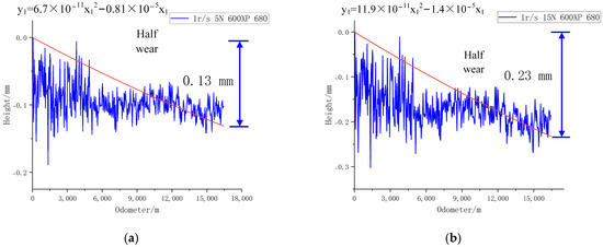 Wear curves of leaf spring for loads of 5 N and 15 N. (a) Wear curve of leaf spring under a load of 5 N using 600XP-680 lubricant as the medium. (b) Wear curve of leaf spring under a load of 15 N using 600XP-680 lubricant as the medium.