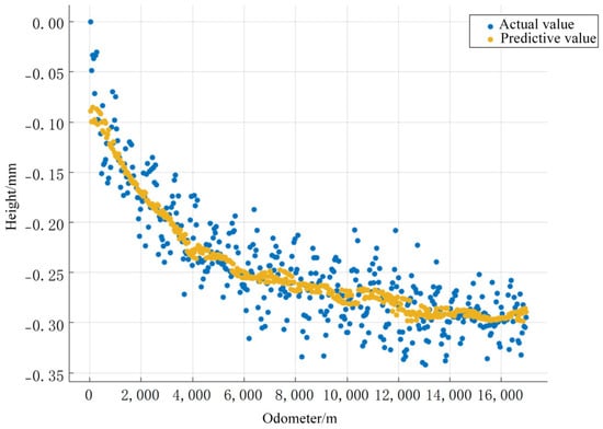 The LS-SVM algorithm was trained for regression prediction of wear under lubrication conditions, and the leaf spring wear under different speed and load conditions was predicted by the regression algorithm. The friction coefficient, motion speed, load size, and running distance are taken as input quantities, and the wear height h is the output quantity; the model training is carried out 24,000 times, and its error evaluation index is shown in Table 7.