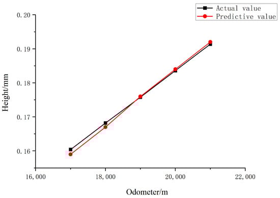 The prediction model predicts 17,000 m, 18,000 m, 19,000 m, 20,000 m, and 21,000 m of wear with 600XP 680 lubricant lubrication medium, 1 r/s speed, and a 10 N load, and compares it with the experimental data, as shown in Figure 37and Table 8.