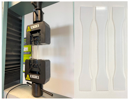 The tensile strength, or the maximum tensile stress applied in stretching a specimen to rupture, and the ultimate elongation, or the elongation at which rupture occurs in the application of continued tensile stress, were recorded. The tensile strength and ultimate elongation measurements were carried out according to ASTM D638 [22] using tensile test dumbbell specimens (type I) and a test speed of 5 mm/min (see Figure 1).
