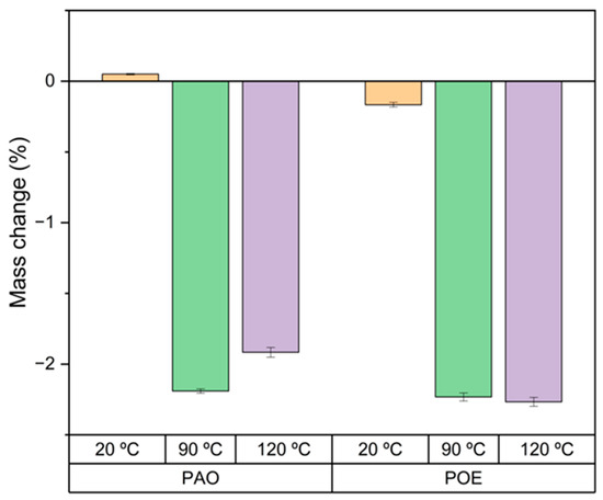 The mass before immersion in the base fluid is compared with the mass after the testing to obtain the mass change value according to Equation 1, and the results are shown in Figure 2. It can be seen that the effects on the mass are greater with temperature, and there was a mass loss slightly bigger for the samples in contact with polyol ester. For both base fluids, the magnitude is similar—around 2%. For the specimens that remained submerged at ambient temperature, the mass change was insignificant since the value is similar to the tolerance error of the balance.