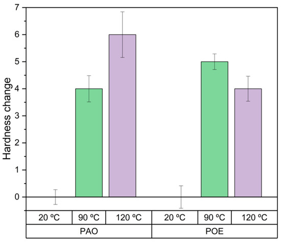 The hardness variation of the specimens subjected to the immersion test is depicted in Figure 3. The reported values were rounded to the nearest whole Shore D points, following ASTM D7216 guidelines. There was no significant variation in hardness for the specimens kept at room temperature. The initial hardness value for the polyamide without immersion was 76 Shore D points. However, the specimens maintained at 90 and 120 °C experienced a hardening of 4 to 6 points on the Shore D scale. The most pronounced change of 6 points was observed in the specimens in contact with PAO at 120 °C.