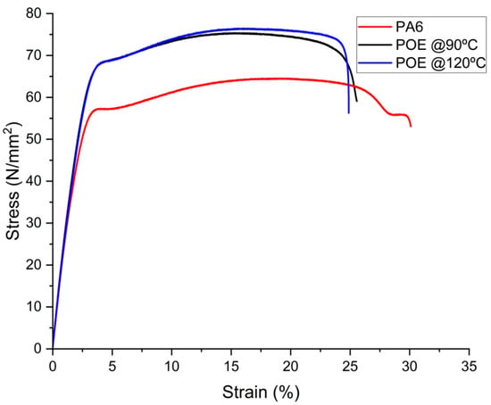 Effect of temperature on tensile curves for PA6 immersed in POE.