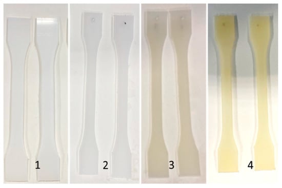 Color change for PA6 original (1) and immersed in POE at 20 °C (2), 90 °C (3), and 120 °C (4).