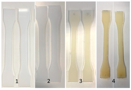 Five samples, type I according to ASTM D638 [22], were used for tensile measurements, and five specimens measuring 2 × 5 cm were used for mass and hardness measurements. Heating was performed in a thermal bath. Lids were used to cover the beakers to reduce evaporation and prevent contamination.