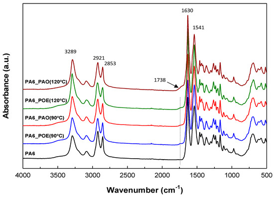 PA6 samples exposed to oil fluids at 90 °C and 120° C were analyzed by Fourier Transform Infrared Spectroscopy using an Attenuated Total Reflection measurement accessory (ATR-FTIR spectroscopy, FT/IR-6200 Jasco, Valencia, Spain) in order to study the chemical changes during the exposition. The FTIR spectra were acquired in the spectral window of 4000 to 400 cm−1 at a resolution of 4 cm−1 with 150 accumulations in ATR mode. All the infrared spectra were processed through an ATR correction and subsequent multiple points baseline correction.