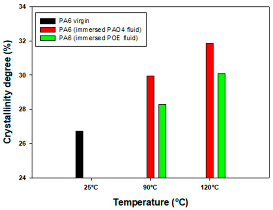 The crystallinity of the virgin PA6 and the samples immersed in fluids at elevated temperatures was calculated according to Section 2.2. The results are presented in Figure 11, where it is evident that the fluid–polymer interaction influenced the degree of crystallization. The fluids in contact with PAO exhibited a higher degree of crystallinity compared to the samples immersed in POE. And an increase in crystallization would cause an increase in the hardness of the material [18], which is congruent with the results obtained in Section 3.2.