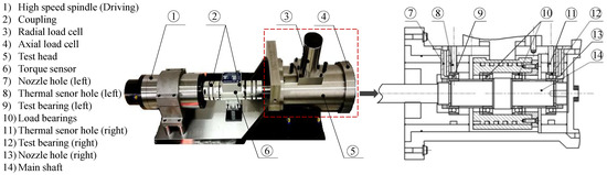 The experiments were conducted on a test device designed for oil–air lubricated rolling bearings. As depicted in Figure 1, the mechanical component of the test apparatus primarily comprises a high-speed spindle, torque sensor, and test head. The high-speed spindle with a power of 5.5 kW imparts motion to the test head via two couplings and a torque sensor. A frequency converter is employed to regulate the rotational speed of the spindle, which can achieve a maximum speed of 12,000 rpm. The frictional torque generated by the bearings installed in the test head is measured by the torque sensor. The accuracy class of the torque sensor is 0.2 N·m, and the nominal speed is 10,000 rpm. The effect of temperature (per 10K in the nominal temperature range) on the output signal (relative to the actual value of the signal span) is 0.1%, and on the zero signal (relative to the nominal sensitivity), it is 0.2%. The radial load cell and axial load cell are utilized to apply the radial and axial loads, respectively, onto the test bearings. The arrangement of the test bearings, nozzles, and thermal sensors is illustrated in the side section of the test head. The two test bearings are asymmetrically installed on the shaft. The thermal sensors (Pt 100) are directly in contact with the outer race of the bearings, which to mearing the temperature rise. The thermal sensor is positioned at the location of oil injection. It should be noted that the measured torque includes both the test bearings and load bearings, necessitating a temperature rise to facilitate the analysis of bearing performance under different operating conditions. The torque sensor, loading sensor, and thermal sensor are calibrated prior to the tests by applying the specified torque, load, and temperature, respectively.