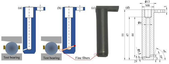 The nozzle types and their structures used in the tests are illustrated in Figure 2. The distinguishing feature of the guiding-structured nozzle, as compared to the conventional nozzle, lies in the presence of fine fibers arranged within the oil injection hole. To facilitate fiber installation, a through hole is manufactured, which allows for convenient attachment of fibers using hot melt glue. Tests confirm that these fibers are firmly attached to the hole without any detachment issues. A detailed depiction of the nozzle structure can be seen in Figure 2d, which shows a 1.5 mm diameter hole and an injection angle of 15°. Furthermore, these nozzles offer ease of installation and disassembly.