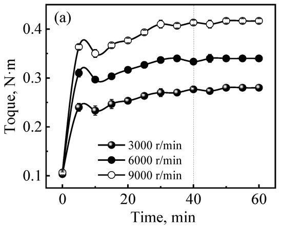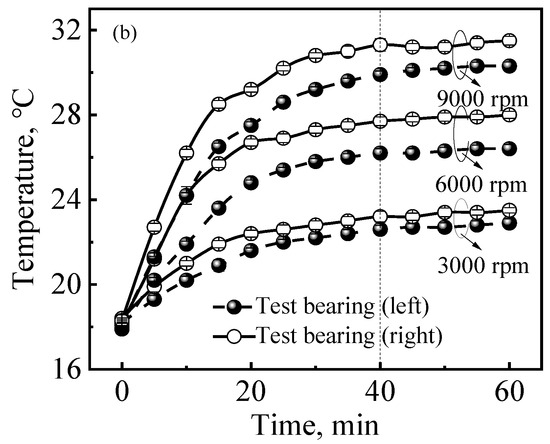 To ensure the reliability and accuracy of the test data, preliminary experiments were conducted to monitor the temporal variations in temperature and torque. A reference oil sample of PAO10 was utilized for this purpose. The tests were repeated three times under each condition. Figure 3 illustrates the experimental results obtained at different rotational speeds. The torque and temperature both exhibit an overall increase with increasing speed. Prior to 40 min, the temperature gradually rises until reaching a plateau. Therefore, subsequent data collection for the test rig is conducted after a 40 min run time. Figure 3 also illustrates the temperature difference between the two test bearings. The higher temperature observed in the right test bearing can be primarily attributed to its proximity to the axial load side and its limited thermal conductivity. The relative error is within 5%, indicating acceptable repeatability. In the subsequent tests, the temperature rise data are obtained from the left test bearing.