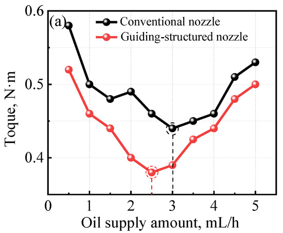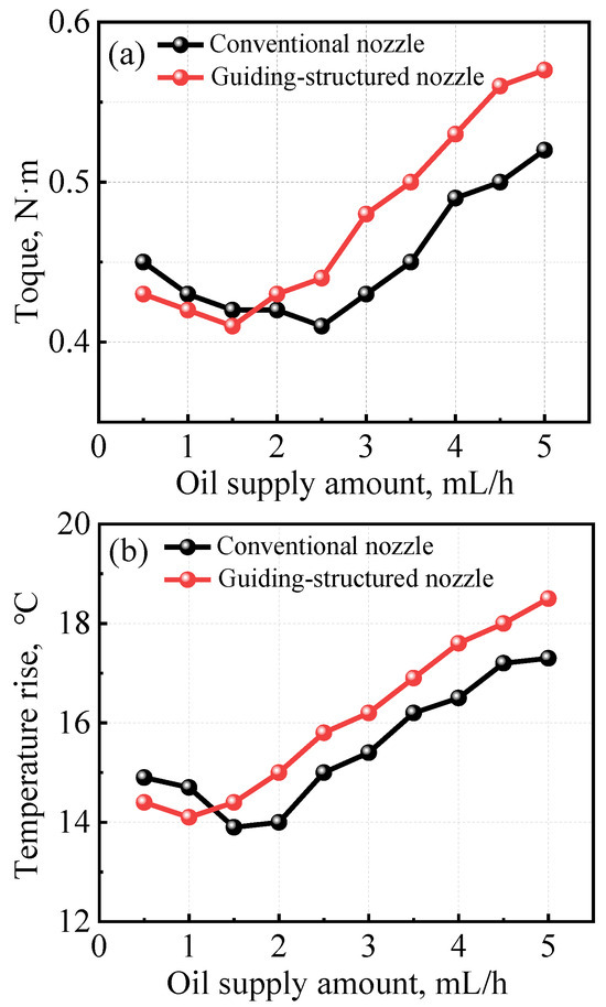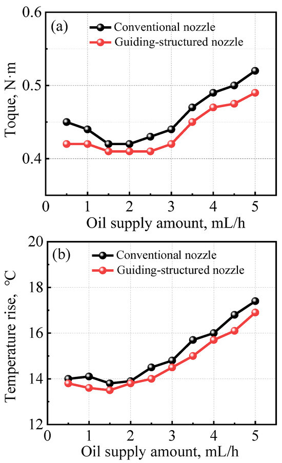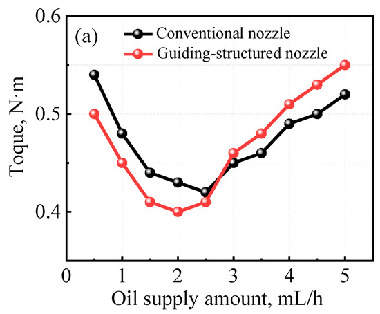 - With an increase in the oil supply amount, both torque and temperature initially decrease and then increase, resulting in an optimal oil supply amount at the turning point. All the results indicate that the guiding-structured nozzle exhibits smaller values for the optimal oil supply amount compared to those of the conventional nozzle, highlighting its superior oil delivery capability.