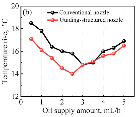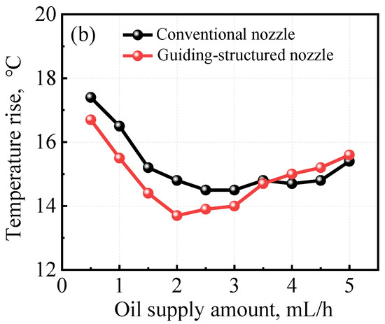 The torque and temperature rise of the two types of nozzles using naphthenic oil are compared in Figure 5. One notable distinction when comparing with Figure 4 is that beyond the optimal point; the torque and temperature rise exceed those of conventional nozzles. This can primarily be attributed to the fact that excessive oil delivered by guiding-structured nozzles is more susceptible to churning loss. Additionally, it was observed that the optimal amount for both nozzle types decreased by 0.5 mL/h, indicating a reduction in oil consumption by 15%.