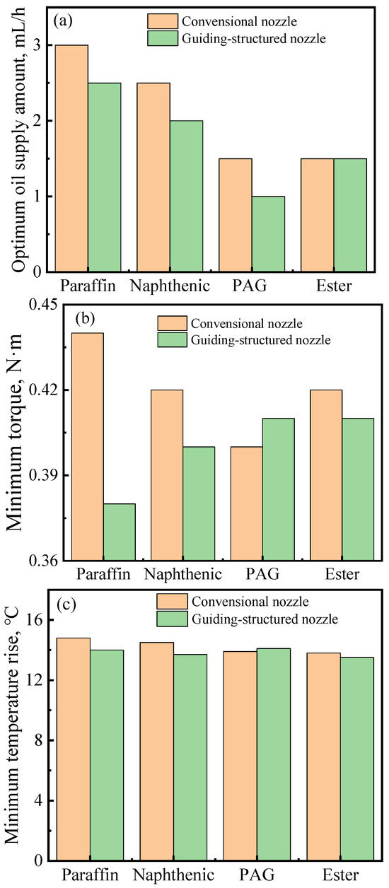 Comparisons of nozzle structures and oil types on optimal oil supply amount and bearing performance. (a) Optimal oil supply amount, (b) minimum torque, (c) temperature rise.