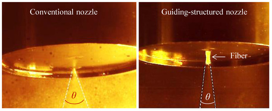 The above results indicate that the guiding-structured nozzle exhibits a higher efficacy in delivering oil into the bearing cavity. To further investigate the underlying mechanism of oil delivery, the injection patterns of both conventional and guiding-structured nozzles were examined, as well as the distribution of oil on solid surfaces. A high-speed camera was utilized to capture the jet flow from the nozzles, which sprays onto a glass disc. Simultaneously, a camera installed under the glass disc was employed to observe and record the distribution of oil droplets. Figure 10 illustrates the injection patterns from these two types of nozzles. Here, θ represents the injection angle, which indicates the extent of divergence. It is evident that the injection pattern of the conventional nozzle displays a larger θ, resulting in more oil droplets being sprayed onto both the cage surface and bearing shoulders due to a small gap between the cage and inner ring. In contrast, for the guiding-structured nozzle, the injection angle θ is smaller, resulting in a more concentrated jet flow. This concentration enhances the oil jetting into the bearing and increases its penetration ability to overcome the air curtain.