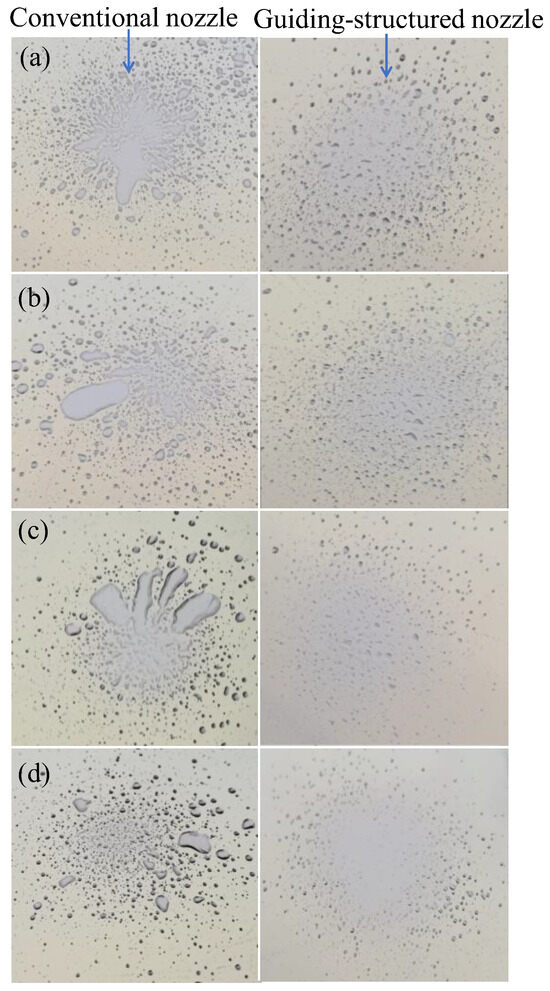 The distributions of oil droplets on the glass surfaces are illustrated in Figure 11. Overall, the droplets sprayed from the guiding-structured nozzle exhibit a uniform and concentrated distribution on the glass surface, with a finer size. In contrast, the distributions of droplets from the conventional nozzle are irregular, characterized by both small droplets and large aggregates. This discrepancy primarily arises due to the intermittent pumping of oil into the oil–air mixture cell. As the oil flows through the nozzle, it tends to accumulate on its surface, leading to aggregation at the outlet. Once a certain amount of aggregation is reached, an abrupt ejection of oil occurs from the nozzle, resulting in patchy distribution patterns. These discontinuous injections cause fluctuations in oil supply to bearings and consequently affect both film formation stability and bearing temperature regulation within spindle systems. However, the utilization of a guiding-structured nozzle leads to droplet refinement as the oil traverses through the guiding fibers. Furthermore, owing to the high interface energy of nylon fibers, there is low adsorption of oil on its surface, thereby ensuring a continuous jet flow and effective suppression of supply fluctuations.