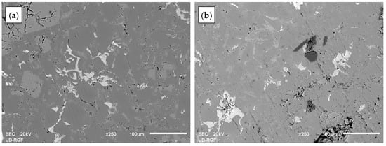 In the matrix alloy, bigger primary Si particles, eutectic Si particles, and intermetallic phases are present (Figure 1a). Matrix alloys with primary Si particles of a larger size can be noticed in microstructural images of hypereutectic Al-Si alloys [35,36,37,38]. The primary Si particles in composite with 0.5 wt.% Al2O3 (25 nm) and 3 wt.% Al2O3 (36 µm), shown in Figure 1b, were refined, but the Al2O3 agglomerates can be noticed. Refinement of primary Si with the addition of Al2O3 [37,38] or the addition of Al2O3/TiO2 nanoparticles in hypereutectic Al-Si alloy was observed in the research conducted by Mahallawi et al. [39]. An agglomeration of Al2O3 nanoparticles was also reported in [37,40]. The needle-like intermetallic phases present in the microstructures of both matrix alloy and composite are β-Al5FeSi which are also noticed in the literature [36,41,42,43]. Irregularly shaped light-coloured phases contain Al-Ni-Cu-(Fe). According to [44], the Al-Ni-Cu-Fe phase is the δ-AlCuNi (Al3(CuNi)2) phase, while the irregularly shaped Al-Ni-Cu phase is the γ-AlCuNi phase (Al7Cu4Ni), which is presented as the brightest phase with very small dimensions.