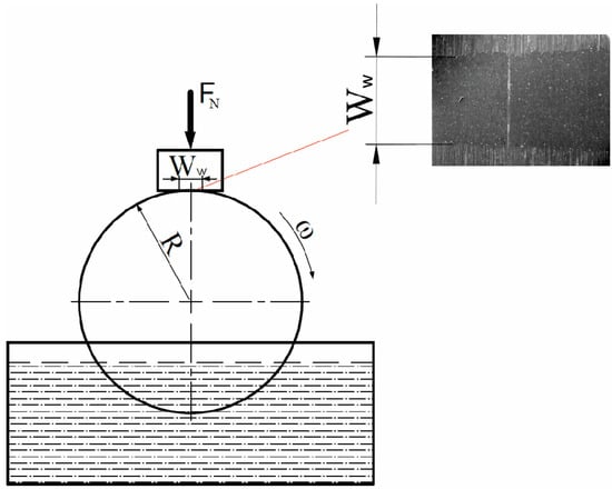 The experimental procedure consisted of tribological tests and microscopical observations of worn surfaces. Composites were machined to appropriate dimensions. Specimens were tested on a block-on-disc tribometer according to the ASTM G77 standard. A schematic of the contact pair (nominal line contact) is given in Figure 2. The counter-body was disc made of quenched and tempered steel EN 42CrMo4 with a diameter of 55 mm and hardness of 51–54 HRC. The contact surfaces of the block and disc for the tribological test had a roughness of approximately Ra = 0.4 μm. Tribological tests were performed in lubricated conditions with motor oil, SAE 5W-30, with a viscosity of 68 mm2/s at 40 °C and 11.5 mm2/s at 100 °C, and a density of 0.848 g/cm3 at 15 °C. The pistons in the engines work on approximately 8 MPa pressure [45,46], so a normal load of 100 N which corresponds to that pressure was selected, as well as 200 N, since some pistons work at higher pressures. The duration of tests was 2000 s, i.e., the sliding distance was 1000 m. The tests were performed in ambient air at room temperature, and oil temperature did not exceed 40 °C. The disc was immersed in an oil container, and, with its rotation, the oil was brought into contact between the disc and the block.