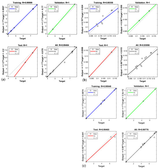 During tribological testing, wear rate (WR) and coefficient of friction (CoF) were obtained, and their results are given in Table 2. These results were used for the ANN. As already stated, ANNs are trained, not programmed, which is the reason why more ANNs were used to observe which network gives the most satisfactory results. The optimal number of neurons in the hidden layer and transfer function are often determined through a trial-and-error process which balances model complexity and performance, which has also been achieved by this research. Many different networks were trained for both transfer functions to obtain the best overall regression coefficient. Different numbers of hidden neurons and transfer functions were applied, and Table 3 shows the results of the ANNs in the form of their overall regression coefficient. MSE was calculated according to Equation (3) and is also shown in Table 3. Firstly, all networks were trained for 5, 10, 15, and 20 neurons in a hidden layer, and the ANN with the highest overall regression coefficient was selected. If the overall regression coefficient of that network was too low then, one by one, another neuron was added to achieve a higher regression coefficient. The best performance for WR was for the ANN with the architecture of 3-15-1 with logsig transfer function (3 inputs, 15 neurons in hidden layer, and 1 output), where the overall regression coefficient was 0.99484, and the regression coefficients for training, validation, and testing were 0.99999, 1, and 1, respectively (Figure 4a). The obtained regression coefficients indicate an excellent fit of the model to the data for WR. Such high values, particularly the overall regression coefficient being close to 1, suggest that the ANN has learned to predict the target variable with a high degree of accuracy. Training, validation, and testing phases imply that the ANN’s predictions are almost exactly in line with the actual data of the dataset, which is also confirmed by the high MSE (Table 3). For CoF, the ANN with an architecture of 3-6-1 and tansig transfer function gave the best output and overall regression coefficient of 0.93096. The CoF regression coefficients for validation and testing were both equal to one which indicates that network behaviour for these phases is almost exactly as it was for the experimental data; however, the regression coefficient for training was 0.89358, which indicates that there will be some degree of deviation between experimental and predicted values (Figure 4b). In order to investigate the ANN’s potential for multiple response prediction, the network with two outputs was trained with an architecture of 3-5-2 and logsig transfer function. After training, the overall regression coefficient was obtained, and it was 0.99776, while the training, testing, and validation regression coefficients were 0.99948, 0.99465, and 1, respectively (Figure 4c). This ANN was selected due to it having the highest MSE for CoF, which indicated a good fit with experimental results (Table 3).