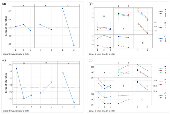 Diagrams of S/N ratio: (a) main effect for wear rate, (b) interaction plot for wear rate, (c) main effect for CoF, and (d) interaction plot for CoF.