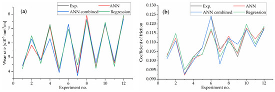 Predicted values of WR and CoF are better for individually trained ANNs than for combined ones (Table 2). The trained ANNs indicate a good correlation between experimental and predicted values based on Figure 4 and Table 2. Figure 4a shows that there is a good correlation between the experimental and predicted values of wear rate, while in Figure 4b, the coefficient of friction has a slight difference between the experimental and predicted values; however, there is still a good correlation between these results. Results show that ANNs can be used for smaller data sets, which corresponds to other authors’ findings [20,25,56].