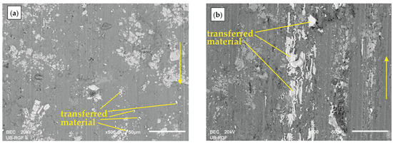 Microstructural characterisation of the worn surface is very complex, as well as the understanding of the wear mechanism. Figure 7 presents SEM images of worn surfaces of matrix alloy and two best-ranked combinations of factors obtained by Taguchi grey analysis (Table 3) for a normal load of 100 N. SEM analysis was carried out at the end of the tests to determine the wear mechanism of the tested materials. Figure 7, with a magnification of 500×, shows surfaces formed during sliding at 0.5 m/s sliding speed under 100 N normal load for a 1000 m sliding distance. Sliding directions are denoted with yellow-coloured arrows on Figure 7a,b. In Figure 7a, shallow grooves can be noticed which indicates mild abrasion, while there are small white fields present which indicate material transfer. For composite with 0.5 wt.% Al2O3 nanoparticles and 3 wt.% Al2O3 microparticles (Figure 7b) deeper grooves were present and bigger white fields appeared on the surface indicating transfer of the material from the steel disc to the composite block.