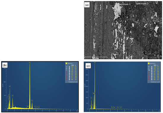 EDS analysis of Al-18Si with 0.5 wt.% Al2O3 nanoparticles and 3 wt.% Al2O3 microparticles tested under 100 N normal load: (a) spectrum positions, (b) Spectrum 1, and (c) Spectrum 2.