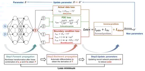 The PINN has several advantages over traditional numerical computation methods [32]. Firstly, it obviates the necessity for mesh generation, simplifying the preprocessing procedures and rendering them applicable to complex structures. Secondly, the PINN is relatively efficient in handling high-dimensional problems, avoiding the dimensionality catastrophe that plagues traditional numerical methods [33]. Finally, the PINN can combine known actual data to solve inverse problems, such as identifying material parameters and unknown boundary conditions [34,35,36,37,38]. Cai [39] used the PINN to obtain temperature and velocity distributions under unknown thermal boundary conditions, a task that is typically challenging for conventional numerical techniques. Go [40] proposed a model for simulating real-time temperature fields based on the PINN, which is capable of accurately estimating the temperature distribution and heat flux of a given heat source, even with limited temperature data. A PINN-based hybrid thermal model was developed by Liao [41], which utilizes partially observable data obtained by an infrared camera to predict the temperature distribution and estimate the unknown material and process parameters that are not directly observable. Zhang [42] divided the composite material into multiple subdomains and then used PINN to acquire the temperature distribution. Pang [43] proposed a PINN approach for assessing the heat generation rate of lithium-ion batteries, and the experimental findings demonstrated that the proposed PINN approach exhibits favorable performance in estimating the heat generation rate of batteries.