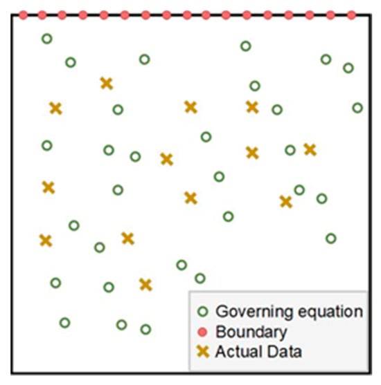 Figure 2 shows the procedure of simulating frictional contact temperature by the PINN. In the initial step, as depicted in Figure 3, the collection points and actual data points are sampled within the computational domain. Subsequently, the neural network propagates forward to obtain the temperature of sampling points. For the second step, backpropagation is performed to calculate the partial differential of T with respect to x, y and , respectively, and the loss for each part can be computed. Finally, the optimization algorithm is employed to update the parameters of the neural network, and the process is iterated until the residual of the loss reaches its minimum value [34,35].