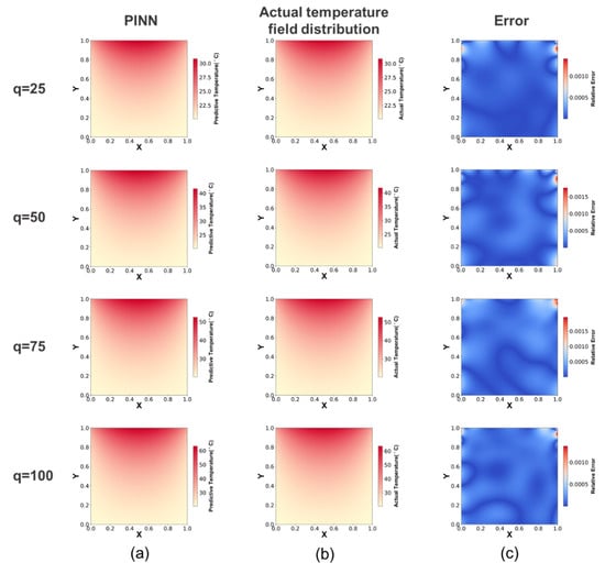 The basic parameters of the simulation are presented in Table 1. This study performs four distinct sets of experiments, each involving different heat flux conditions, with the aim of simulating frictional contact temperature across a range of operational scenarios. The simulation results obtained by the PINN were compared with the actual temperature field distribution simulated by Comsol. The simulation accuracy of the PINN was quantified by the mean relative error (MRE). Figure 5a,b represent the simulation results obtained by the PINN and Comsol, respectively, and Figure 5c represents the relative error distribution of the PINN. Based on the experimental results, it is evident that the PINN is capable of accurately simulating frictional contact temperature. The MRE for various operational conditions is presented in Table 2.