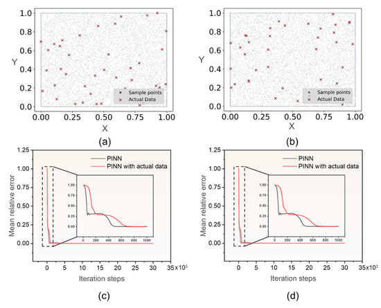 The PINN can not only perform forward calculation under the constraints of PDE and boundary conditions, but can also be combined with actual data to assist the training process. Figure 6a,b illustrate the random selection of 40 actual data points within the computational domain, which were subsequently incorporated into the training process of the PINN. The MRE of the temperature field under various experimental conditions is presented in Table 2. Figure 6c,d depict the convergence curve of the PINN and PINN with actual data. According to the experimental results, it can be observed that the convergence rate of the PINN is relatively slower when actual data are incorporated into its training process compared to the convergence rate of the PINN without actual data. However, Table 2 reveals that the incorporation of actual data into the training process of the PINN enhances its predictive accuracy.