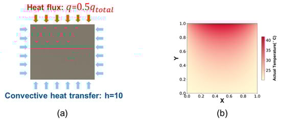 When the HPC and CHTC are given, the calculation of the frictional contact temperature can be simplified to the heat transfer process depicted in Figure 4a. In this section, the PINN, combined with actual data, is utilized to solve the frictional contact temperature under the ambiguous boundary conditions, and the HPC and CHTC can be obtained inversely. The actual temperature is obtained by Comsol under the experimental conditions shown in Table 3. The top boundary is the heat flux boundary condition, where the total heat flux is 100 W/m2 and the HPC is 0.5; the boundary conditions on the left, right, and bottom are convective boundary conditions, with CHTC of 10 and ambient temperature of 20 °C. The experimental conditions and temperature distribution of the actual temperature field are shown in Figure 7b.